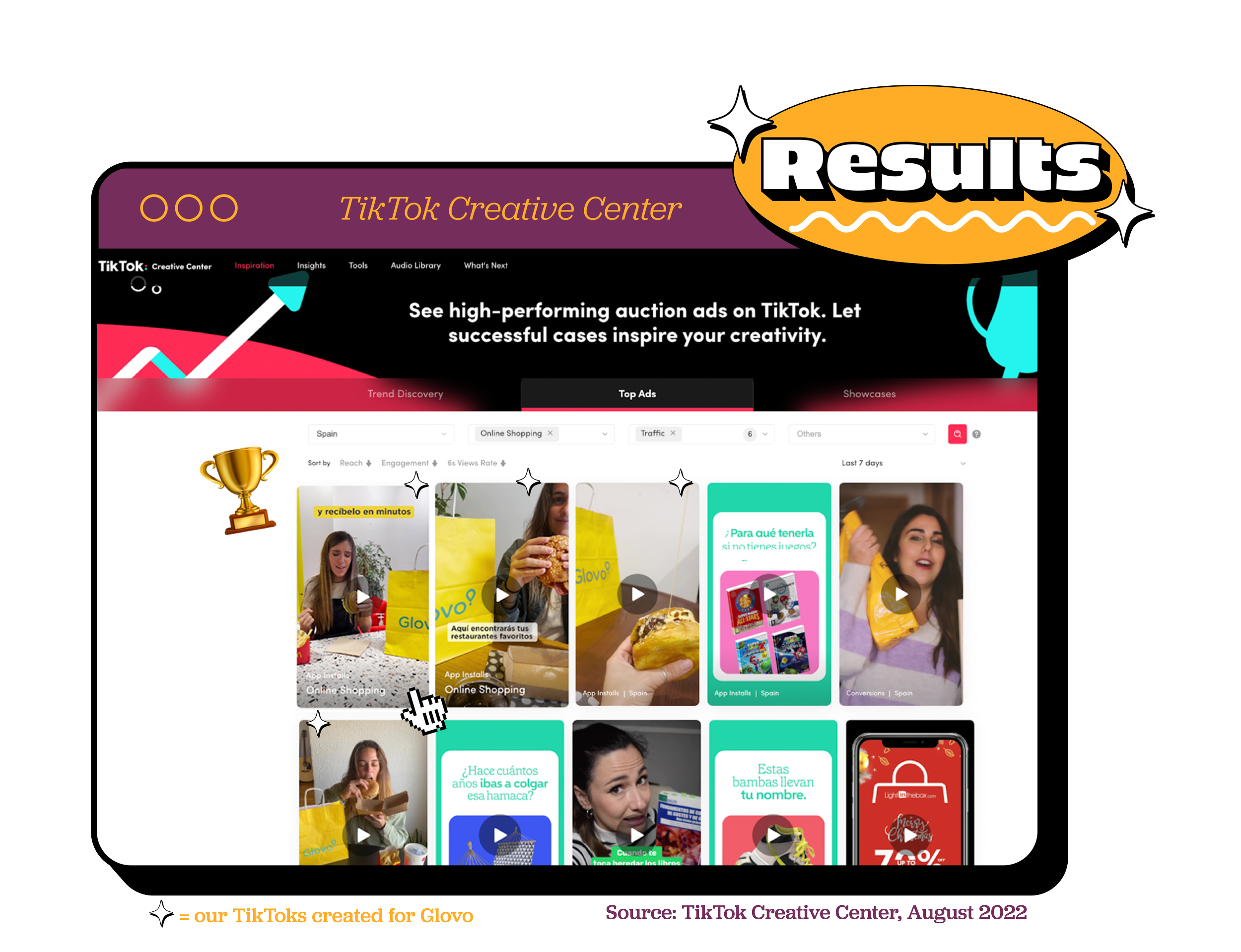 These TikTok Campaigns brought +28K new installs and +26M Views- on the TikToks. Many of these concepts were featured in the “TikTok Creative Center” since they were in the top 5 TikTok ads in their region. Also, the TikTok team personally congratulated Michelle (our Creative Director 🍌) on her fantastic work translating the platform's native trends into Glovo’s brand in such a unique and successful way 💛.